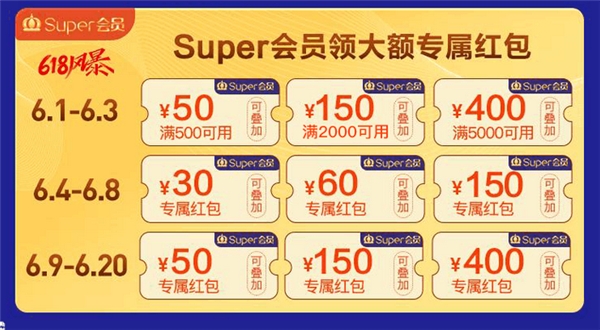 Super会员自带省钱基因,光是今年618期间的会员红包就足够领到手软。6月1日到6月3日和6月9日到6月20日两个时间段,会员可领取600元专属红包,6月4日到8日,会员可领取240元专属红包。红包还可叠加使用,只需在苏宁易购APP搜索“会员红包”就可到达领取页面了。