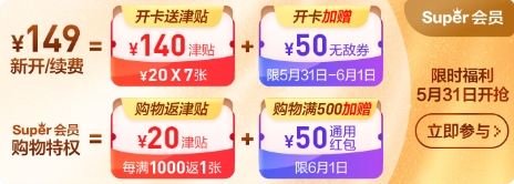 先说Super会员吧,作为2020年最值的电商会员,今年618它再次不负众望。6月9日,开通或者续费苏宁易购Super会员,支付成功后立即返50元无敌券。加上此前常规的140元津贴权益,相当于149元开通后,返190元的红包,只赚不亏。说一句“618最强VIP权益”没人反驳吧?就现在,在苏宁易购APP输入“省钱风暴”便能立刻参加活动。